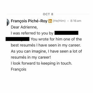 Adrienne, great job on the cover letter and resume. I was blown away by the presentation and the content; I almost didn't recognize myself. Your attention to detail and careful analysis and translation of my skills is exceptional.